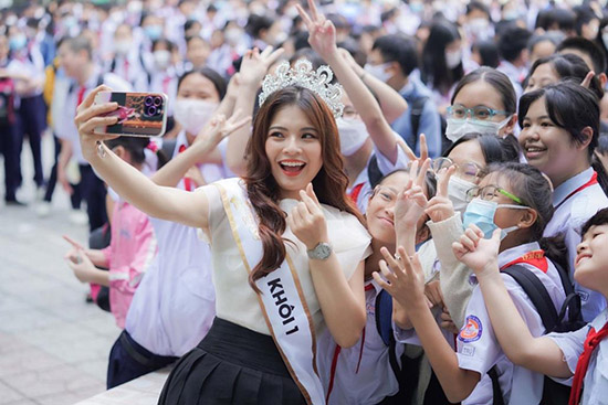Giáng Ngọc chụp ảnh lưu niệm cùng các bạn học sinh